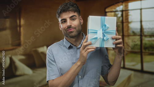 Fototapeta premium Young hispanic man holds blue ribboned gift box with hand and smiles in...