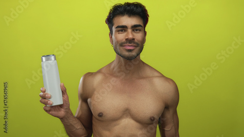 © Krakenimages.com, Fototapeta premium Young hispanic man holds white shampoo bottle showing bare chest in limegreen studio; confidence approval.