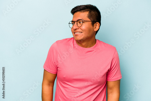 © Asier, Fototapeta premium Young hispanic man isolated on blue background laughs and closes eyes, feels relaxed and happy.