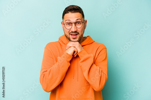© Asier, Fototapeta premium Young hispanic man isolated on blue background praying for luck, amazed and opening mouth looking to front.