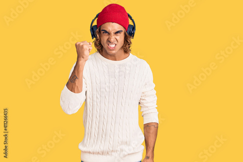 © Krakenimages.com, Fototapeta premium Young hispanic man listening to music using headphones angry and mad raising fist frustrated and furious while shouting with anger. rage and aggressive concept.