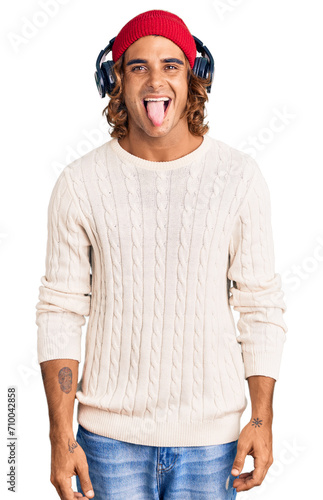 Fototapeta premium Young hispanic man listening to music using headphones sticking tongue out happy with funny expression. emotion concept.