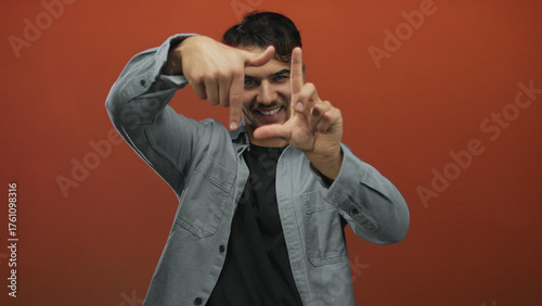 © Krakenimages.com, Fototapeta premium Young hispanic man making frame gestures with hands on an isolated red background, expressing creativity and focus in a filmmaking or photography context.
