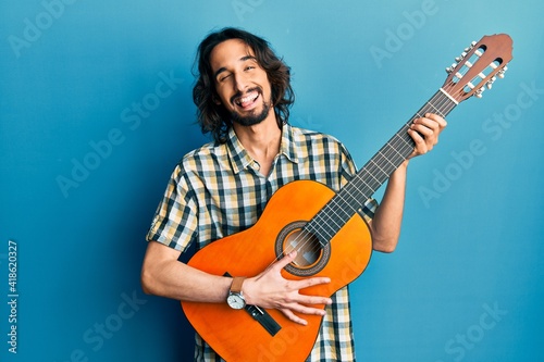 Obraz premium Young hispanic man playing classical guitar winking looking at the camera with sexy expression, cheerful and happy face.