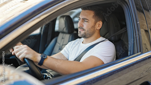 Obraz premium Young hispanic man smiling confident driving car at street
