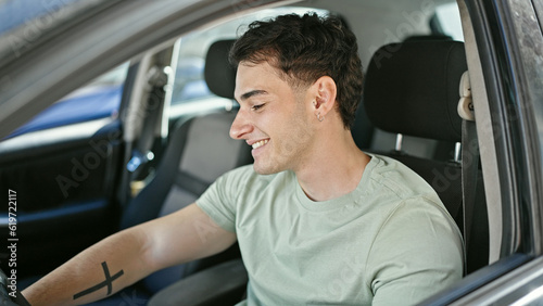 Obraz premium Young hispanic man smiling confident driving car at street
