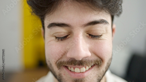 © Krakenimages.com, Fototapeta premium Young hispanic man smiling confident sitting on sofa at home