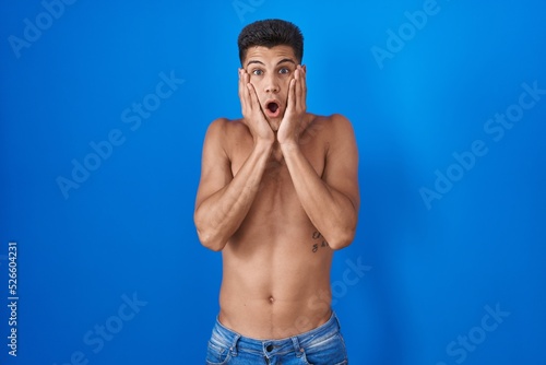 © Krakenimages.com, Fototapeta premium Young hispanic man standing shirtless over blue background afraid and shocked, surprise and amazed expression with hands on face