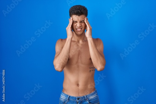 © Krakenimages.com, Fototapeta premium Young hispanic man standing shirtless over blue background with hand on head, headache because stress. suffering migraine.