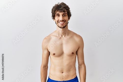 © Krakenimages.com, Fototapeta premium Young hispanic man standing shirtless over isolated, background with a happy and cool smile on face. lucky person.