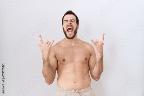 © Krakenimages.com, Fototapeta premium Young hispanic man standing shirtless over white background shouting with crazy expression doing rock symbol with hands up. music star. heavy concept.