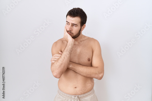 Fototapeta premium Young hispanic man standing shirtless over white background thinking looking...