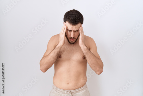 © Krakenimages.com, Fototapeta premium Young hispanic man standing shirtless over white background with hand on head for pain in head because stress. suffering migraine.