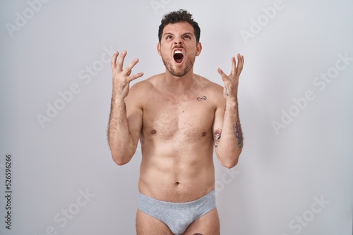 © Krakenimages.com, Fototapeta premium Young hispanic man standing shirtless wearing underware crazy and mad shouting and yelling with aggressive expression and arms raised. frustration concept.