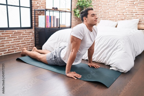 Fototapeta premium Young hispanic man stretching back sitting on floor at bedroom