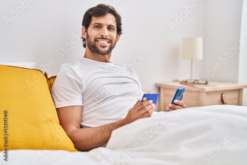 Obraz premium Young hispanic man using smartphone and credit card sitting on bed at bedroom