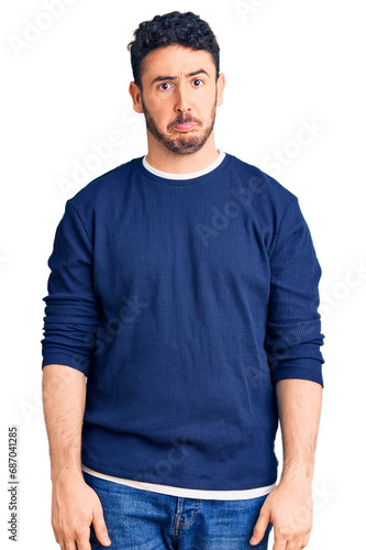 Fototapeta premium Young hispanic man wearing casual clothes depressed and worry for distress,...