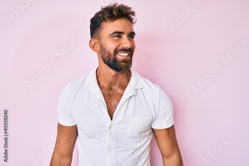 Obraz premium Young hispanic man wearing casual clothes looking away to side with smile on...