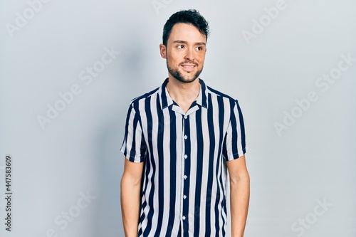 Fototapeta premium Young hispanic man wearing casual clothes looking away to side with smile on...