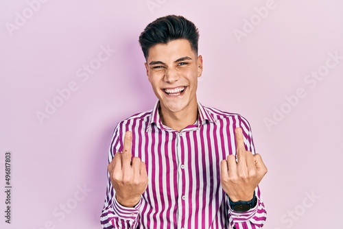 © Krakenimages.com, Obraz premium Young hispanic man wearing casual clothes showing middle finger doing fuck you bad expression, provocation and rude attitude. screaming excited