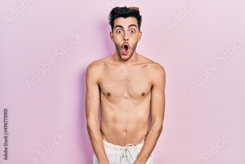 Fototapeta premium Young hispanic man wearing swimwear shirtless afraid and shocked with...