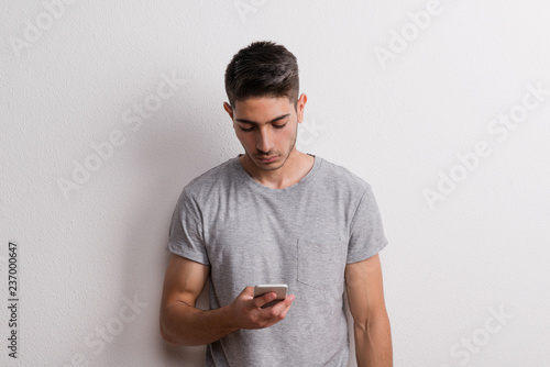 © Halfpoint, Obraz premium Young hispanic man with smartphone standing in a studio, text messaging.