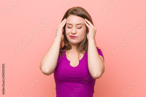 Fototapeta premium Young hispanic woman against a pink wall touching temples and having headache.