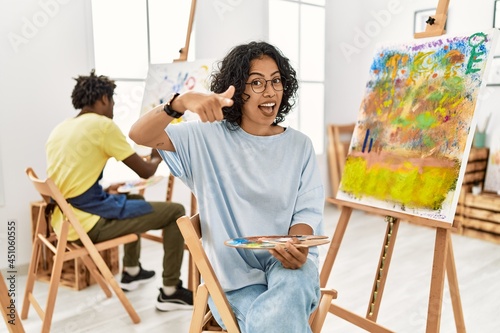 Obraz premium Young hispanic woman at art studio pointing fingers to camera with happy and...