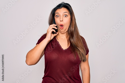 © Krakenimages.com, Fototapeta premium Young hispanic woman having a conversation talking on smartphone over isolated background scared in shock with a surprise face, afraid and excited with fear expression