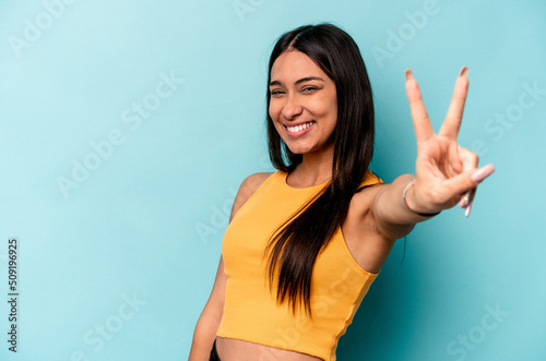 © Asier, Fototapeta premium Young hispanic woman isolated on blue background joyful and carefree showing a peace symbol with fingers.
