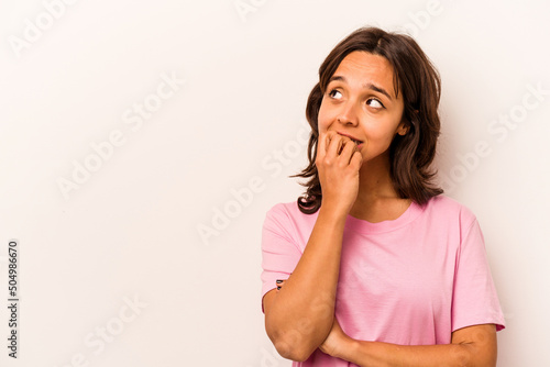 © Asier, Fototapeta premium Young hispanic woman isolated on white background relaxed thinking about something looking at a copy space.