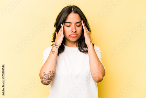 Fototapeta premium Young hispanic woman isolated on yellow background having a head ache, touching front of the face.