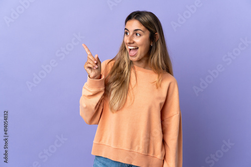 © luismolinero, Fototapeta premium Young hispanic woman over isolated purple background intending to realizes the solution while lifting a finger up