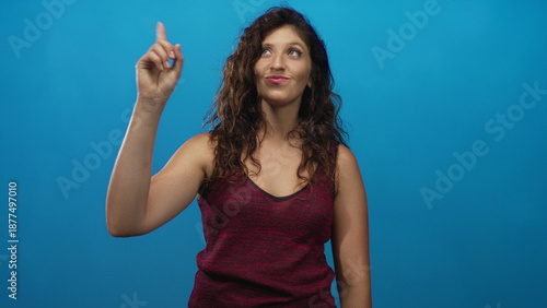 © Krakenimages.com, Fototapeta premium Young hispanic woman pointing index finger upward with raised arm in studio; confidence curiosity discovery.