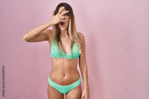 © Krakenimages.com, Fototapeta premium Young hispanic woman wearing bikini over pink background peeking in shock covering face and eyes with hand, looking through fingers with embarrassed expression.
