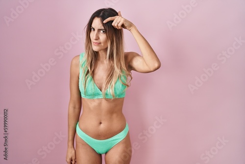Obraz premium Young hispanic woman wearing bikini over pink background pointing unhappy to...