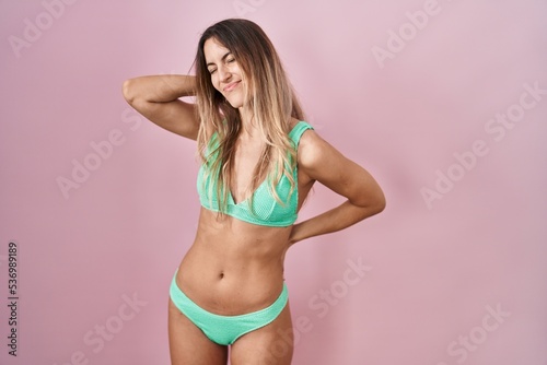 Naklejka premium Young hispanic woman wearing bikini over pink background suffering of neck...