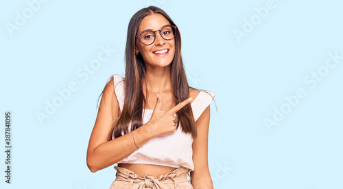 Fototapeta premium Young hispanic woman wearing casual clothes and glasses cheerful with a smile on face pointing with hand and finger up to the side with happy and natural expression