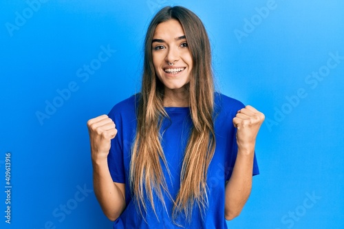 © Krakenimages.com, Fototapeta premium Young hispanic woman wearing casual clothes celebrating surprised and amazed for success with arms raised and open eyes. winner concept.