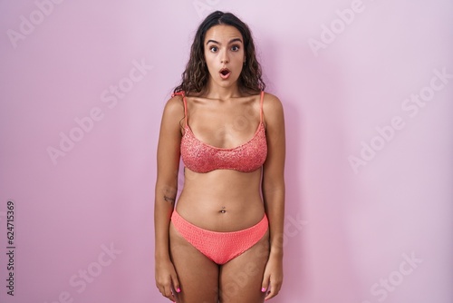 © Krakenimages.com, Naklejka premium Young hispanic woman wearing lingerie over pink background afraid and shocked with surprise and amazed expression, fear and excited face.