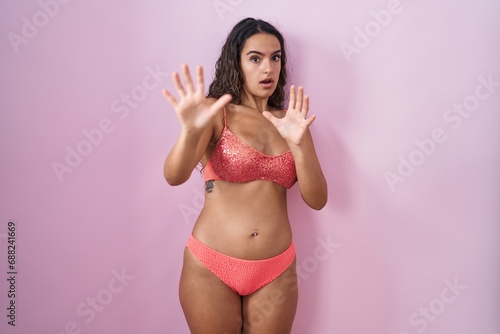 © Krakenimages.com, Obraz premium Young hispanic woman wearing lingerie over pink background afraid and terrified with fear expression stop gesture with hands, shouting in shock. panic concept.