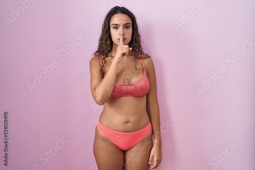 © Krakenimages.com, Fototapeta premium Young hispanic woman wearing lingerie over pink background asking to be quiet with finger on lips. silence and secret concept.