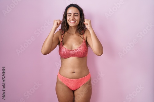 © Krakenimages.com, Obraz premium Young hispanic woman wearing lingerie over pink background excited for success with arms raised and eyes closed celebrating victory smiling. winner concept.