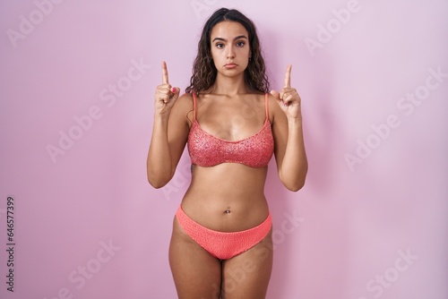 © Krakenimages.com, Naklejka premium Young hispanic woman wearing lingerie over pink background pointing up looking sad and upset, indicating direction with fingers, unhappy and depressed.
