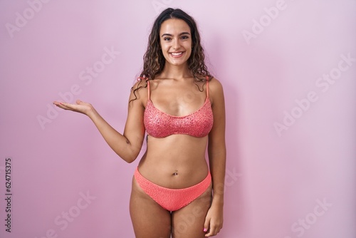 © Krakenimages.com, Naklejka premium Young hispanic woman wearing lingerie over pink background smiling cheerful presenting and pointing with palm of hand looking at the camera.