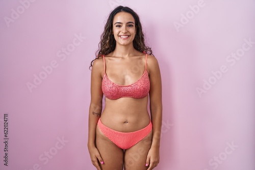 © Krakenimages.com, Fototapeta premium Young hispanic woman wearing lingerie over pink background with a happy and cool smile on face. lucky person.