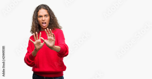 © Krakenimages.com, Fototapeta premium Young hispanic woman wearing red sweater afraid and terrified with fear expression stop gesture with hands, shouting in shock. Panic concept.