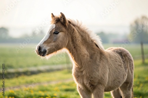 © Earthen Stock, Obraz premium Young horse or foal standing in a blurry green field