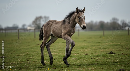 © Joko, Fototapeta premium Young Horse Running in Field on a Cloudy Day with Green Grass