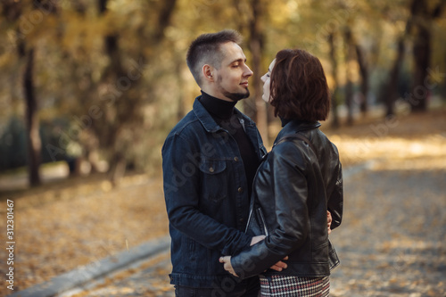 Fototapeta premium Young hugging couple of lovers in the autumn park.